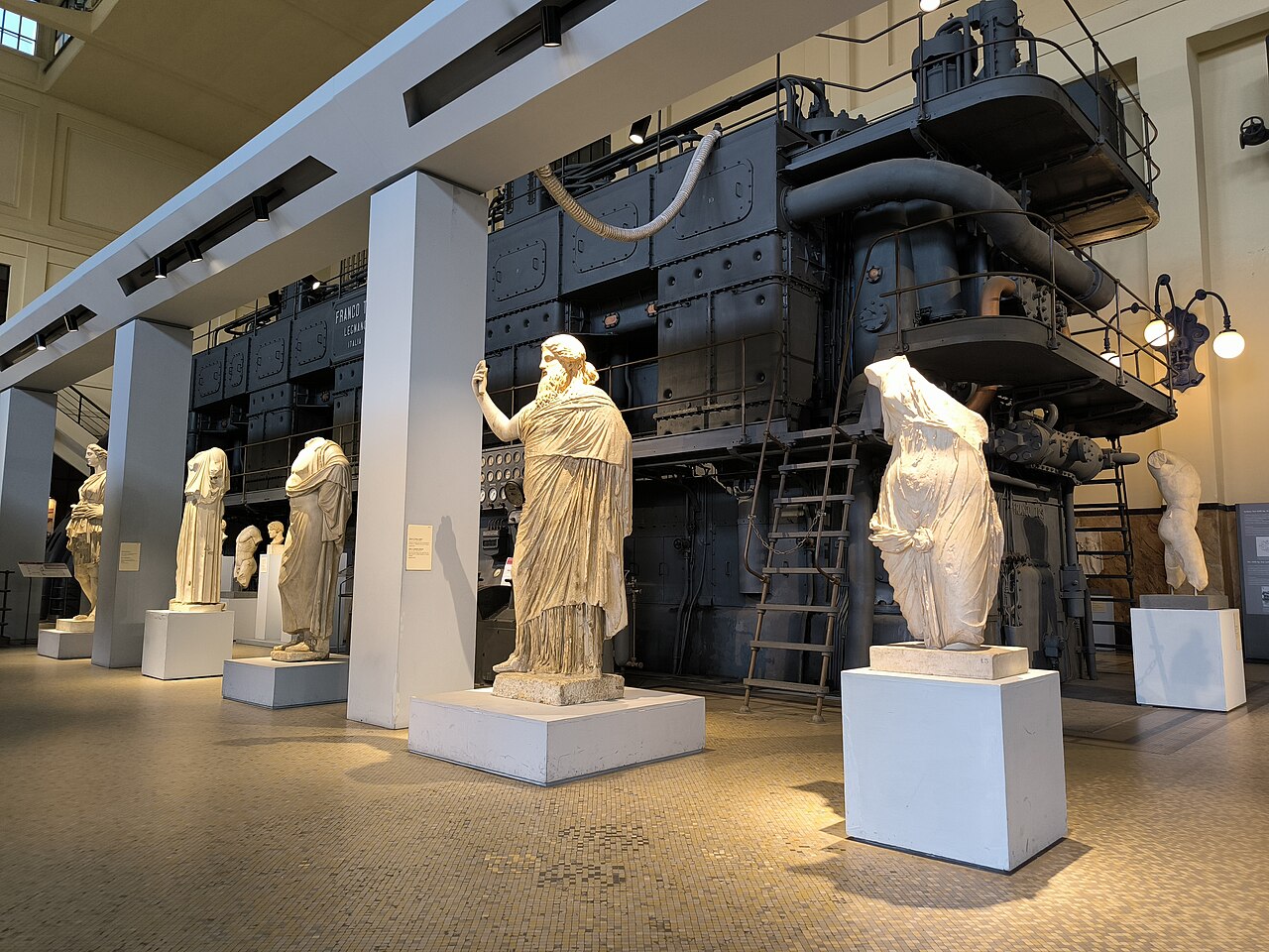 La gigantesca maquinaria industrial convive con las piezas de la Roma clásica. Ambos elementos, que serían dignos de ser visitados por separado, no pueden ser más opuestos, y se encuentran ahora en un diálogo insospechado, que resulta sugestivo.